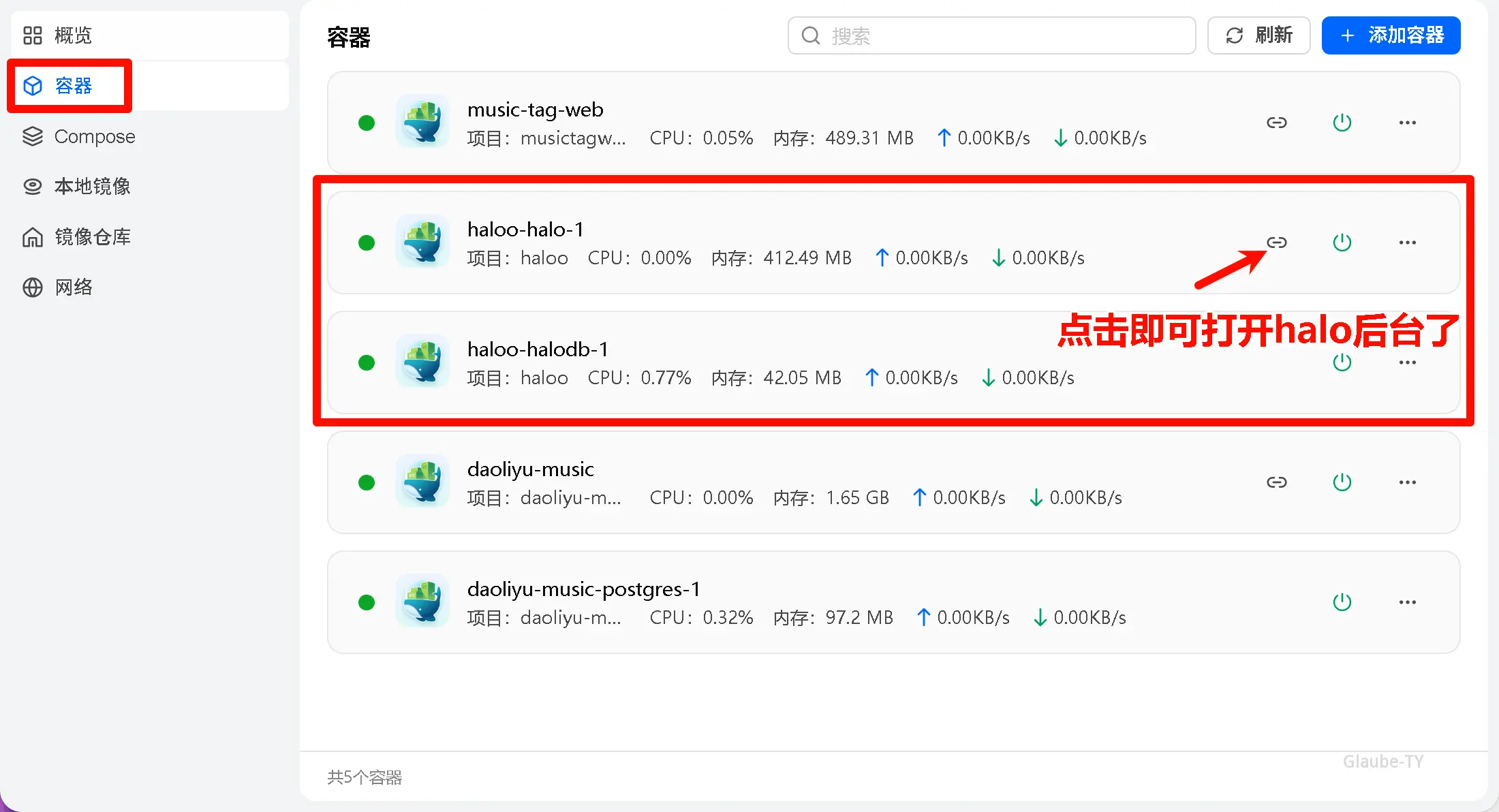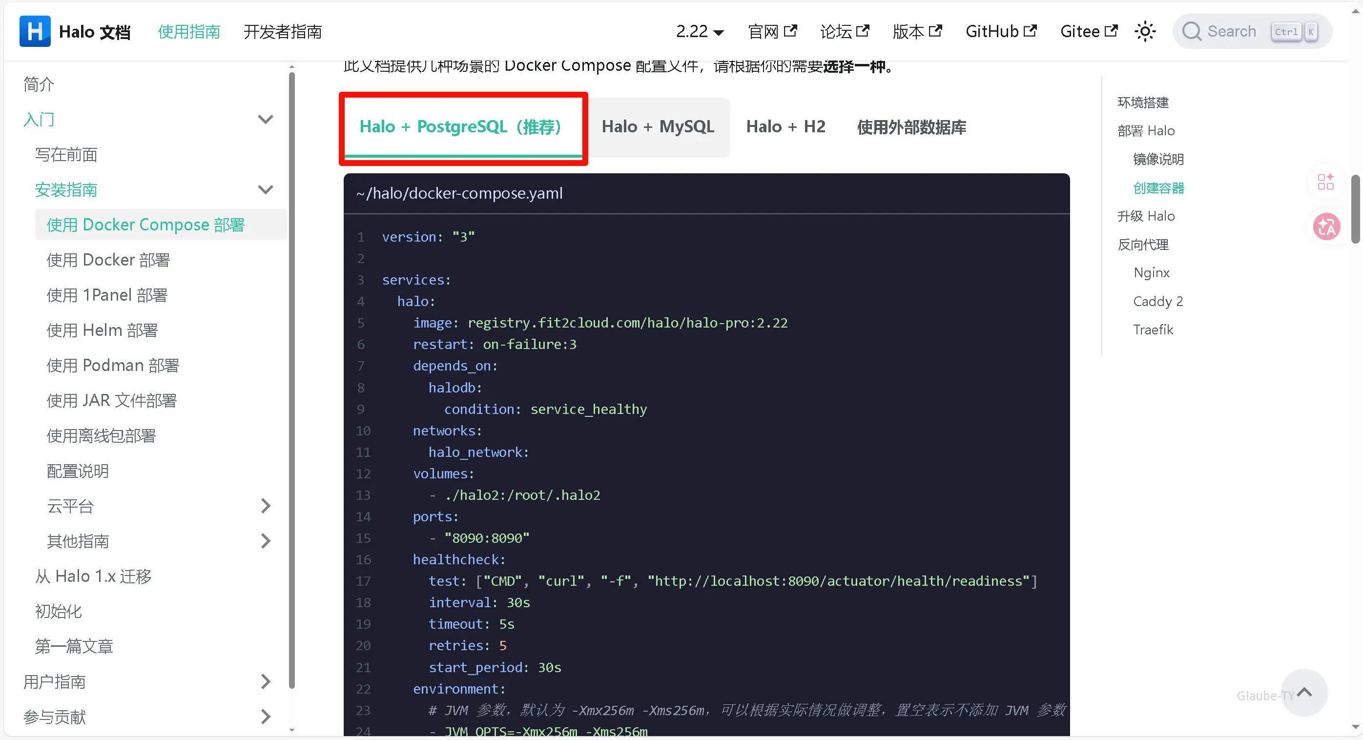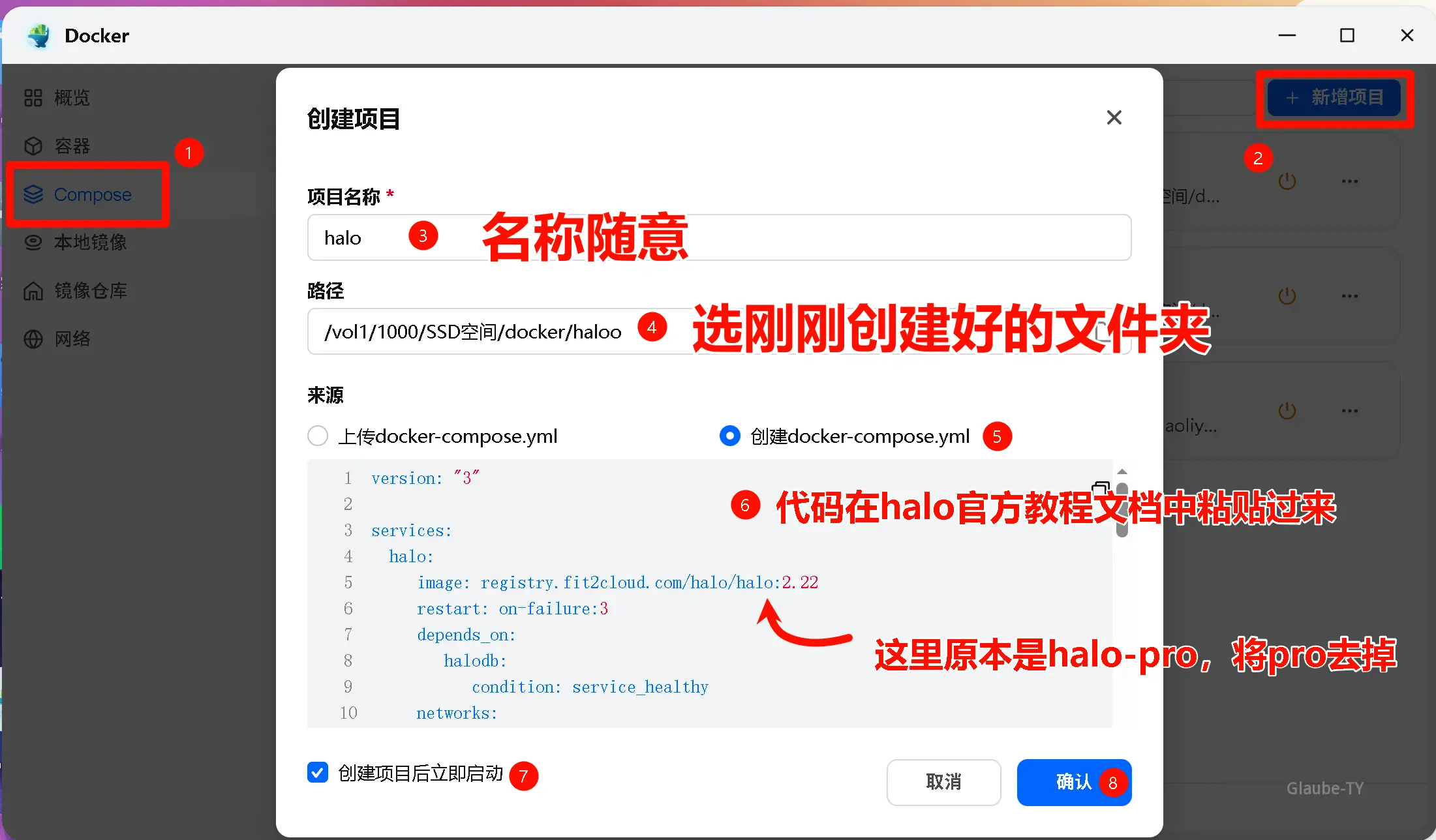 进入 Docker → compose → 新增项目 → 填写名称 → 选择安装路径 → 创建docker-compose.yml → 在官网复制代码(注意要选Halo + PostgreSQL)→ 修改代码中的 halo-pro 为halo (因为pro是付费版,同时确保后面的版本号是最新的,具体的版本号规则就在同样的文档里面)→ 勾选立即启动 → 确认