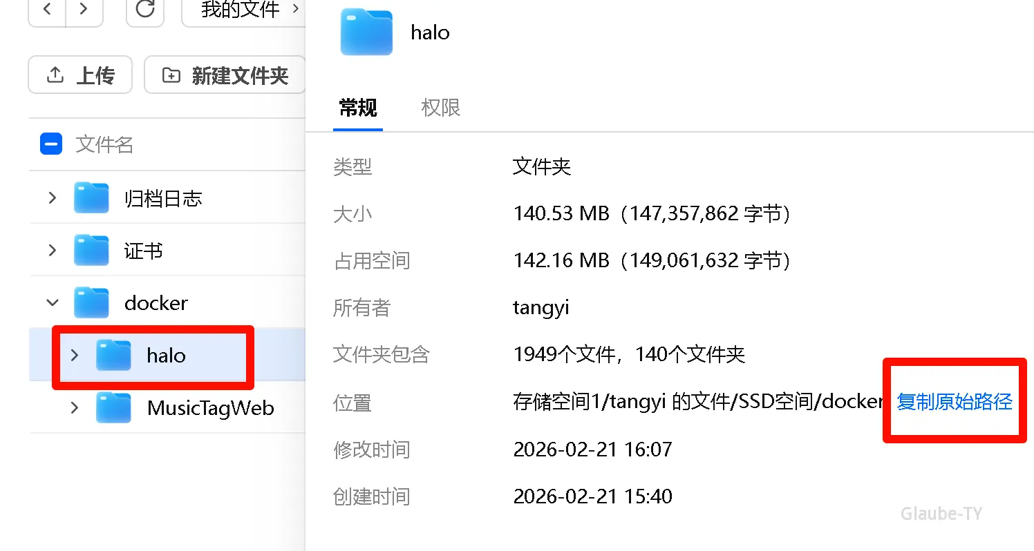 在自己的飞牛文件中新建一个文件夹用来存放 Halo 的 Docker 文件,同时复制路径后面用。